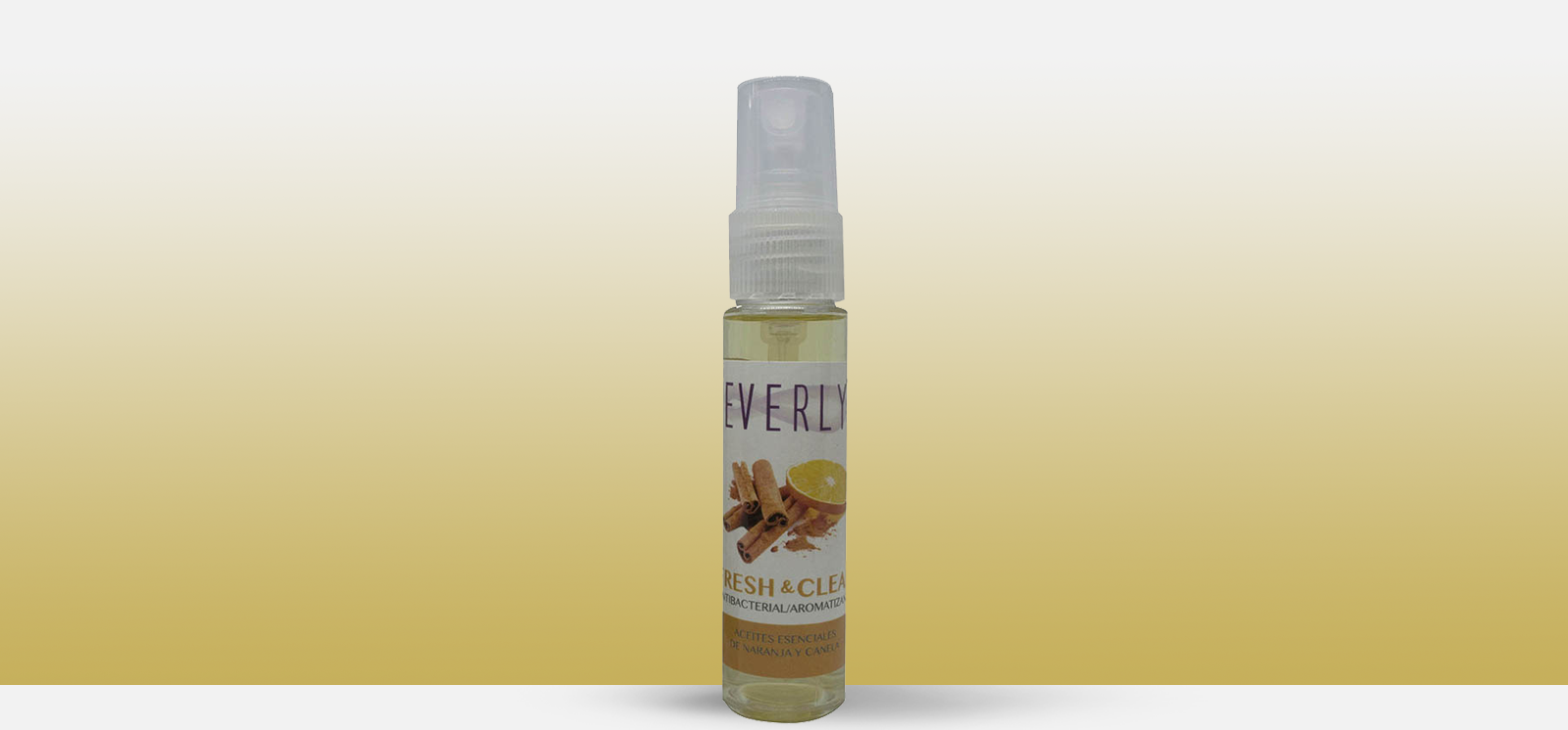 Everly Fresh Clean es un spray antibacterial ideal para desinfectar superficies y al mismo tiempo dejar un agradable aroma. Con el poder limpiador del aceite esencial de Naranja y el efecto antiséptico y antimicrobiano del aceite de Canela. Sin fragancias artificales.